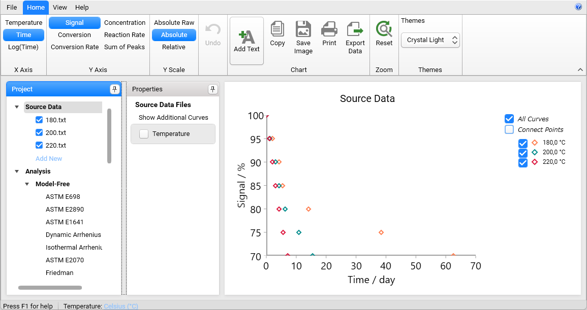 If Connect Points in the legend is activated, then the data points at the same temperature are connected with the straight lines: